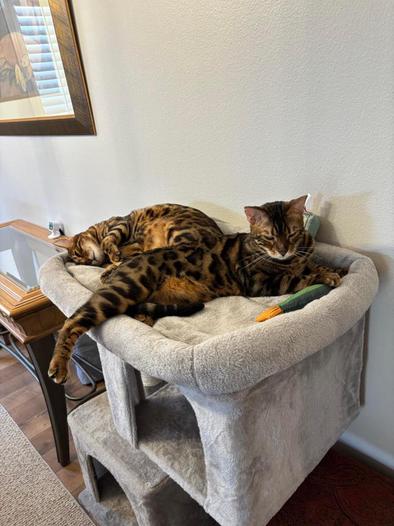 PANCAKE: Right. The point is: the energy in the house is different now. Softer. Slower. There are more quiet moments where we all just… exist together. It’s kind of beautiful. I like to rub up against the Tall One and purr so hard my whole body vibrates. It’s my way of saying, “Hey. I’m here. You’re not alone.”