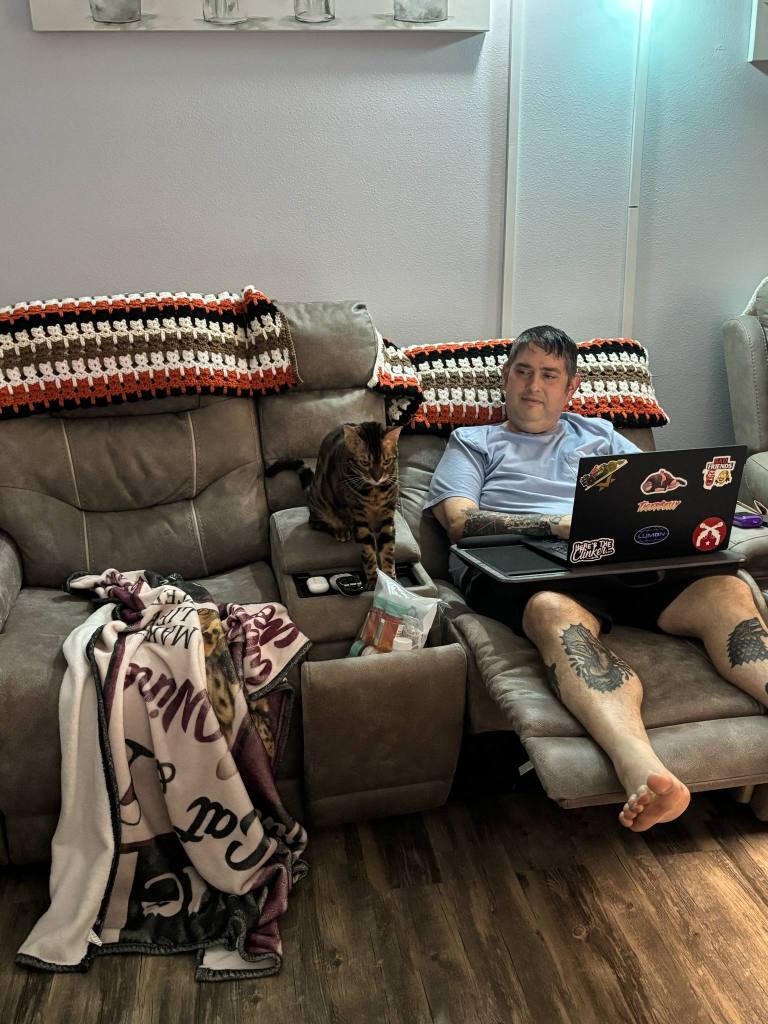 OT came by around 3pm. I was finishing up in the bathroom getting cleaned up from the PT. She was much nicer to Chip. She petted him and let him sniff her laptop. She didn’t once get mad or tell me how to treat my babies. She and the PT guy said I’ve come a long way since they started coming here for therapy. I’ve been doing my exercises most days when they aren’t here. Not everyday but most days. I don’t want to fall in a “hole” or anything so I keep my strength up with the exercises. I am more independent with my needs now than I was at the start. I’m bathing myself, preparing meals, light clean up with dishes after meals etc. Trying my best and darndest to do it on my own. So both “graduated” me from my therapy. So happy to be done with them. No more strangers in the house, no more snide comments about my kitties. GTFO with that nonsense. These babies are more valuable than some human life. I will defend my boys to my dying days.